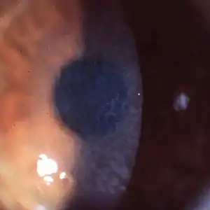 With time, the corneal changes progress into opacities in Bowman's membrane, which gradually becomes more irregular and more dense.[1] Significant vision loss may occur.[2] However, vascularization of the cornea is not present.[2]
