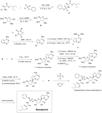Remdesivir can be synthesized in multiple steps from ribose derivatives. The figure to the right is one of the synthesis routes of remdesivir invented by Chun and coauthors from Gilead Sciences.[44][45] In this method, intermediate a is firstly prepared from L-alanine and phenyl phosphorodichloridate in presence of triethylamine and dichloromethane; triple benzyl-protected ribose is oxidized by dimethyl sulfoxide with acetic anhydride and give the lactone intermediate b; pyrrolo[2,1-f] [1,2,4]triazin-4-amine is brominated, and the amine group is protected by excess trimethylsilyl chloride. n-Butyllithium undergoes a halogen-lithium exchange reaction with the bromide at −78 °C (−108 °F) to yield the intermediate c. The intermediate b is then added to a solution containing intermediate c dropwise. After quenching the reaction in a weakly acidic aqueous solution, a mixture of 1:1 anomers was obtained. It was then reacted with an excess of trimethylsilyl cyanide in dichloromethane at −78 °C (−108 °F) for 10 minutes. Trimethylsilyl triflate was added and reacts for one additional hour, and the mixture was quenched in an aqueous sodium hydrogen carbonate. A nitrile intermediate was obtained. The protective group, benzyl, was then removed with boron trichloride in dichloromethane at −20 °C (−4 °F). The excess of boron trichloride was quenched in a mixture of potassium carbonate and methanol. A benzyl-free intermediate was obtained. The isomers were then separated via reversed-phase HPLC. The optically pure compound and intermediate a are reacted with trimethyl phosphate and methylimidazole to obtain a diastereomer mixture of remdesivir. In the end, optically pure remdesivir can be obtained through chiral resolution methods.