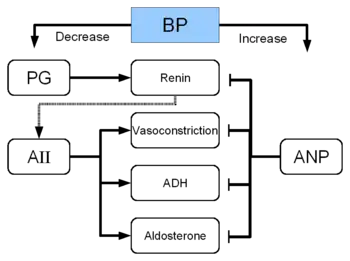 These effects directly act together to increase blood pressure and are opposed by atrial natriuretic peptide (ANP).