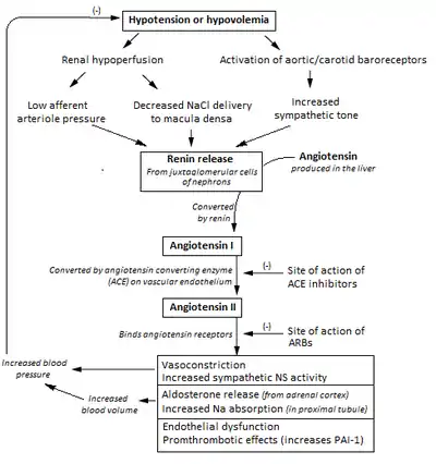 When renal blood flow is reduced, juxtaglomerular cells in the kidneys convert the precursor prorenin (already present in the blood) into renin and secrete it directly into circulation. Plasma renin then carries out the conversion of angiotensinogen, released by the liver, to angiotensin I.[3] Angiotensin I is subsequently converted to angiotensin II by the angiotensin-converting enzyme (ACE) found on the surface of vascular endothelial cells, predominantly those of the lungs.[4] Angiotensin II is a potent vasoconstrictive peptide that causes blood vessels to narrow, resulting in increased blood pressure.[5] Angiotensin II also stimulates the secretion of the hormone aldosterone[5] from the adrenal cortex. Aldosterone causes the renal tubules to increase the reabsorption of sodium which in consequence causes the reabsorption of water into the blood, while at the same time causing the excretion of potassium (to maintain electrolyte balance). This increases the volume of extracellular fluid in the body, which also increases blood pressure.