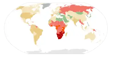 There is a significant relationship between the quality of maternal services made available and the greater financial standings of a country.[19] Sub-Saharan Africa and South Asia exemplify this as these regions are significantly deprived of medical staff and affordable health opportunities.[20] Most countries provide for their health services through a combination of funding from government tax revenue and local households.[19] Poorer nations or regions with extremely concentrated wealth can leave citizens on the margins uncared for or overlooked. However, the lack of proper leadership can result in a nation's public sectors being mishandled or poorly performing despite said nation's resources and standing.[19] In addition, poorer nations funding their medical services through taxes places a greater financial burden on the public and effectively the mothers themselves.[20] Responsibility and accountability on the part of mental health sectors are strongly emphasized as to what will remedy the poor quality of maternal health globally.[20] The impact of different maternal health interventions across the globe stagger variously and are vastly uneven.[19] This is the result of a lack of political and financial commitment to the issue as most safe motherhood programs internationally have to compete for significant funding.[20] Some resolve that if global survival initiatives were promoted and properly funded it would prove to be mutually beneficial for the international community. Investing in maternal health would ultimately advance several issues such as: gender inequality, poverty and general global health standards.[21] As it currently stands, pregnant women are subjugated to high financial costs throughout the duration of their term internationally that are highly taxing and strenuous.