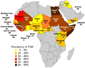 Female genital mutilation (FGM), also known as female genital circumcision or cutting, is the traditional, non-medical practice of altering or injuring the female reproductive organs, often by removing all or parts of the external genitalia.[59] It is mostly practiced in 30 countries in Africa, the Middle East, and Asia, and affects over 200 million women and girls worldwide. More severe forms of FGM are highly concentrated in Djibouti, Eritrea, Ethiopia, Somalia, and Sudan.[60]