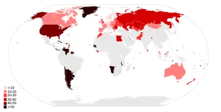 99% of maternal deaths occur in developing countries, and in 25 years, the maternal mortality globally dropped to 44%.[16] Statistically, a woman's chance of survival during childbirth is closely tied to her social economic status, access to healthcare, where she lives geographically, and cultural norms.[17] To compare, a woman dies of complications from childbirth every minute in developing countries versus a total of 1% of total maternal mortality deaths in developed countries. Women in developing countries have little access to family planning services, different cultural practices, have lack of information, birthing attendants, prenatal care, birth control, postnatal care, lack of access to health care and are typically in poverty. In 2015, those in low-income countries had access to antenatal care visits averaged to 40% and were preventable.[16][17] All these reasons led to an increase in the maternal mortality ratio (MMR).