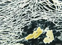 | darkfield microscopic photo of the cell body (Z) of Reticulomyxa filosa. In the lower right of the picture you see some food particles (F) (wheat germ) surrounded by the fine stands of the Reticulopodial Network (R) | |