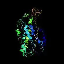 Rhodopsin is a transmembrane protein (Rh1) that is the primary visual pigment (photopigment) of rod photoreceptors (which are the only cells in the retina to express rhodopsin and which express it as their most abundant protein[19]) and forms an integral part of the visual cascade.[13][20][27] It is a G-protein-coupled receptor activated by light that initiates the phototransduction cascade (visual transduction cascade taking place in photoreceptor rod outer segments.[27]) converting light signals to electrophysiological signals in retinal neurons. This photo-activated signal transduction process is essential for vision.[13]