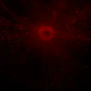 A false-color image of a flat-mounted rat retina viewed through a fluorescence microscope at 50x magnification. The optic nerve was injected with a fluorophore, causing retinal ganglion cells to fluoresce.