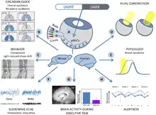 The retinohypothalamic tract (RHT) is a photic neural input pathway involved in the circadian rhythms of mammals.[1] The origin of the retinohypothalamic tract is the intrinsically photosensitive retinal ganglion cells (ipRGC), which contain the photopigment melanopsin. The axons of the ipRGCs belonging to the retinohypothalamic tract project directly, monosynaptically, to the suprachiasmatic nuclei (SCN) via the optic nerve and the optic chiasm.[2][3] The suprachiasmatic nuclei receive and interpret information on environmental light, dark and day length, important in the entrainment of the "body clock". They can coordinate peripheral "clocks" and direct the pineal gland to secrete the hormone melatonin.