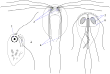 | Retortamonas (Retortamonadida), on left; Hexamita, on center, and Giardia, on right (both Diplomonadida) | |