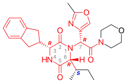 Retosiban consists of a central 2,5 diketopiperazine ring with an R-indanyl group at the 3 position and an R (S-secButyl) at the 6 position, both cis to each other, and with a R-2-methyl oxazole ring at the 7 position in the acyclic amide attached to the N1-position. Retosiban is the (3R, 6R, 7R)-isomer and is a sub-nanomolar (Ki = 0.65 nM) oxytocin receptor antagonist, while the (3R, 6R, 7S)-isomer where the stereochemistry in the amide side-chain at C-7 is inverted, is 10-fold less potent. Typically in this series of 2,5 diketopiperazine oxytocin antagonists the (3S, 6S, 7S) isomer is >500 less active than the (3R, 6R, 7R)-isomer. In addition to the 2,5 diketopiperazine essential core, retosiban also contains several structural characteristics that improve its effectiveness and safety. An indanyl group at position 3 is the best choice in terms of oxytocin receptor antagonist potency, its replacement by phenethyl and benzyl groups led to a progressive weakening of activity. At C-3, a 4-carbon branched alkyl was shown to be preferred with R (S-secButyl) being the best; smaller alkyl groups result in reduced antagonist activity.[4] The 2-methyl oxazole ring at the 7 position gives good aqueous solubility, low protein binding and minimal Cyp450 interaction. This structure–activity relationship (SAR) is supported by the crystal structure of the human oxytocin receptor in complex with retosiban, [7] where the lipophilic indanyl substituent penetrates into a deep, mainly hydrophobic crevice at the bottom of the binding pocket, while the oxazol-morpholine amide moiety is closest to the extracellular surface. The oxazole ring is the most solvent-exposed substituent, and the morpholine ring has no direct interactions with the receptor. The 2,5-diketopiperazine core specifically interacts with the receptor through a polar interaction interface.