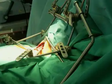 A retractor is a surgical instrument used to separate the edges of a surgical incision or wound, or to hold back underlying organs and tissues so that body parts under the incision may be accessed. The general term retractor usually describes a simple handheld steel tool possessing a curved, hooked, or angled blade and fitted with a comfortable handle, that when in place maintains the desired position of a given region of tissue. These simple retractors may be handheld, clamped in place, or suspended at the end of a robotic arm. Retractors can also be self-retaining and not need to be held once inserted by having two or more opposing blades or hooks which are separated via spring, ratchet, worm gear or other method. The term retractor is also used to describe distinct, hand-cranked devices such as rib spreaders (also known as thoracic retractors, or distractors) with which surgeons may forcefully drive tissues apart to obtain exposure. For specialized situations such as spinal surgery, retractors have been fitted both with suction and with fiberoptic lights to keep a surgical wound dry and illuminated.