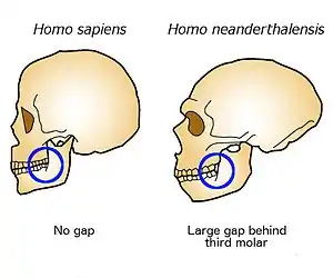 This gap is generally small or absent in modern humans, but it was more often present in Neanderthals,[1] and it was common among some prehistoric Amerindians, such as Arikara and Mandan.[2][3]