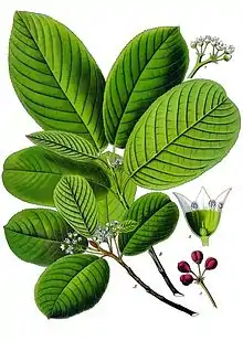 Cascara was used in traditional medicine as a laxative, although there is insufficient scientific evidence for such an effect.[14][16] The dried, aged bark of R. purshiana used by indigenous native peoples and immigrant Euro-Americans as a supposed laxative is based on anthraquinone-containing herbal preparations of leaves and fruits of senna, the latex of Aloe vera, and the root of the rhubarb plant.[24] Commercially, it is called "cascara sagrada" ('sacred bark' in Spanish), while traditionally it is known as "chittem bark" or "chitticum bark".[16] The historical interest in using cascara damaged native cascara populations during the 1900s due to overharvesting.[25]