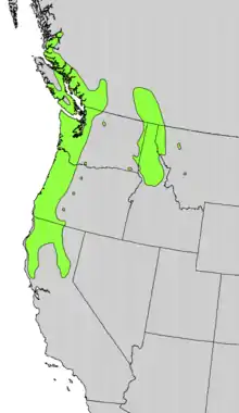 Cascara is native from northern California to British Columbia and east to the Rocky Mountains in Montana.[10] It is often found along streamsides in the mixed deciduous-coniferous forests of valleys, and in moist montane forests.[11] Cascara is common in the understory of bigleaf maple forest, alongside red osier dogwood and red alder.[12]