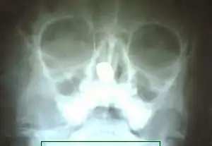 A rhinolith is a stone present in the nasal cavity. The word is derived from the roots rhino- and -lith, literally meaning "nose stone". It is an uncommon medical phenomenon, not to be confused with dried nasal mucus. A rhinolith usually forms around the nucleus of a small exogenous foreign body, blood clot or secretion by slow deposition of calcium and magnesium salts(carbonate and Phosphate salt). Over a period of time, they grow into large irregular masses that fill the nasal cavity. They may cause pressure necrosis of the nasal septum or lateral wall of nose. Rhinoliths can cause nasal obstruction, epistaxis, headache, sinusitis and epiphora. They can be diagnosed from the history with unilateral foul-smelling blood-stained nasal discharge or by anterior rhinoscopy. On probing, the probe can be passed around all its corners. In both CT and MRI a rhinolith will appear like a radiopaque irregular material. Small rhinoliths can be removed by a foreign body hook. Whereas large rhinoliths can be removed either by crushing with Luc's forceps or by Moore's lateral rhinotomy approach.[1][2]