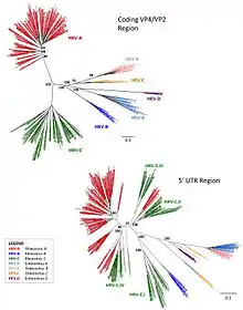 - Palmenberg AC, Spiro D, Kuzmickas R, Wang S, Djikeng A, Rathe JA, et al. (April 2009). "Sequencing and analyses of all known human rhinovirus genomes reveal structure and evolution". Science. 324 (5923): 55–9. Bibcode:2009Sci...324...55P. doi:10.1126/science.1165557. PMC 3923423. PMID 19213880.