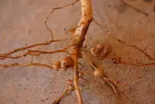 Rhizobia are a "group of soil bacteria that infect the roots of legumes to form root nodules".[2] Rhizobia are found in the soil and after infection, produce nodules in the legume where they fix nitrogen gas (N2) from the atmosphere turning it into a more readily useful form of nitrogen. From here, the nitrogen is exported from the nodules and used for growth in the legume. Once the legume dies, the nodule breaks down and releases the rhizobia back into the soil where they can live individually or reinfect a new legume host.[2]
