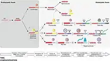 Both kingdoms in Riboviria show a relation to the reverse transcriptases of group II introns that encode RTs and retrotransposons, which are self-replicating DNA sequences, the latter of which self-replicate via reverse transcription and integrate themselves into other parts of the same DNA molecule. Reverse transcribing viruses, assigned to Pararnavirae, appear to have evolved from a retrotransposon on a single occasion. The origin of the RdRps of Orthornavirae is less clear due to a lack of information, but two scenarios have been suggested. The most likely scenario is that the RdRps of viruses in Orthornavirae originated from the reverse transcriptase of a bacterial group II intron shortly before the emergence of eukaryotes.[2][8][9] The other possibility is that the RdRps of Orthornavirae originated before the last universal common ancestor (LUCA) and that they preceded the retroelement reverse transcriptases.[10][11]