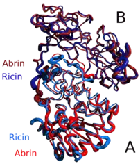 A comparison of the similar structures of abrin-a (red) and ricin (blue)