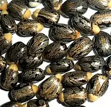 The seeds of Ricinus communis are commonly crushed to extract castor oil. As ricin is not oil-soluble, little is found in the extracted castor oil.[10] The extracted oil is also heated to more than 80 °C (176 °F) to denature any ricin that may be present.[10] The remaining spent crushed seeds, called variously the "cake", "oil cake", and "press cake", can contain up to 5% ricin.[36] While the oil cake from coconut, peanuts, and sometimes cotton seeds can be used as either cattle feed and/or fertilizer, the toxic nature of castor beans precludes their oil cake from being used as feed unless the ricin is first deactivated by autoclaving.[37] Accidental ingestion of Ricinus communis cake intended for fertilizer has been reported to be responsible for fatal ricin poisoning in animals.[29][38]