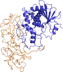 Ricin structure (PDB: 2AAI). The A chain is shown in blue and the B chain in orange.