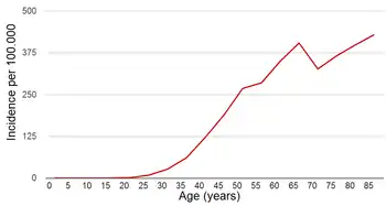 The risk of getting breast cancer increases with age. A woman is more than 100 times more likely to develop breast cancer in her 60s than in her 20s.[4] If all women lived to age 95, about one in eight would be diagnosed with breast cancer at some point during their lives.[5] However, the actual lifetime risk is lower than that, because 90% of women die before age 95, most commonly from heart attacks, strokes, or other forms of cancer.