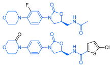 Rivaroxaban bears a striking structural similarity to the antibiotic linezolid: both drugs share the same oxazolidinone-derived core structure. Accordingly, rivaroxaban was studied for any possible antimicrobial effects and for the possibility of mitochondrial toxicity, which is a known complication of long-term linezolid use. Studies found that neither rivaroxaban nor its metabolites have any antibiotic effect against Gram-positive bacteria. As for mitochondrial toxicity, in vitro studies published before 2008 found the risk to be low.[33]