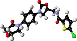 - Roehrig S, Straub A, Pohlmann J, Lampe T, Pernerstorfer J, Schlemmer KH, et al. (September 2005). "Discovery of the novel antithrombotic agent 5-chloro-N-({(5S)-2-oxo-3- [4-(3-oxomorpholin-4-yl)phenyl]-1,3-oxazolidin-5-yl}methyl)thiophene- 2-carboxamide (BAY 59-7939): an oral, direct factor Xa inhibitor". Journal of Medicinal Chemistry. 48 (19): 5900–8. doi:10.1021/jm050101d. PMID 16161994.