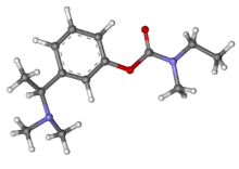 Rivastigmine (sold under the trade name Exelon among others) is a cholinesterase inhibitor used for the treatment of mild to moderate Alzheimer's disease and Parkinson's.[1] The drug can be administered orally or via a transdermal patch; the latter form reduces the prevalence of side effects,[2] which typically include nausea and vomiting.[3]