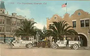 The City of Riverside Fire Department can trace its origin back to 1875 from a newspaper article referencing the response of a hose cart to a fire in the township of Riverside. An unorganized group of volunteers existed in the Riverside township from December 1871 to April 1882. In April 1882, Frank Miller, the owner of the Mission Inn, convinced local businessmen to contribute towards a wagon and fire buckets, costing $500.[4] Subsequently, William Hayt, a businessman and owner of several stage lines, began a drive to establish a complete fire department. Hayt got the city's Board of Trustees agreement to establish the Riverside Fire Department, but only after Hayt offered to raise half the money from local businessmen, and to put up the other half of the funds himself, to be reimbursed later. Hayt was able to raise $527, he loaned the city an additional $516, and the Riverside Fire Department was officially established on October 7, 1887.[5]