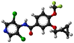 Roflumilast, sold under the trade name Daxas among others, is a drug that acts as a selective, long-acting inhibitor of the enzyme phosphodiesterase-4 (PDE-4). It has anti-inflammatory effects and is used as an orally administered drug for the treatment of inflammatory conditions of the lungs such as chronic obstructive pulmonary disease (COPD).[6][7][8][9]