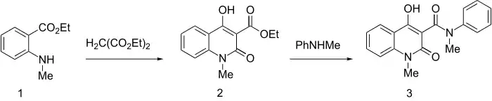 Ethyl 2-(methylamino)benzoate is condensed with ethyl malonate. Amine-ester interchange of that compound with N-methylaniline results in formation of the amide roquinimex.
