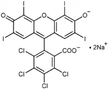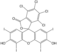 Rose bengal (4,5,6,7-tetrachloro-2',4',5',7'-tetraiodofluorescein) is a stain. Rose bengal belongs to the class of organic compounds called xanthenes.[1] Its sodium salt is commonly used in eye drops to stain damaged conjunctival and corneal cells and thereby identify damage to the eye. The stain is also used in the preparation of Foraminifera for microscopic analysis, allowing the distinction between forms that were alive or dead at the time of collection.