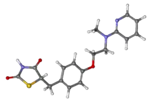 Rosiglitazone (trade name Avandia) is an antidiabetic drug in the thiazolidinedione class. It works as an insulin sensitizer, by binding to the PPAR in fat cells and making the cells more responsive to insulin. It is marketed by the pharmaceutical company GlaxoSmithKline (GSK) as a stand-alone drug or for use in combination with metformin or with glimepiride. First released in 1999, annual sales peaked at approximately $2.5-billion in 2006; however, following a meta-analysis in 2007 that linked the drug's use to an increased risk of heart attack,[1] sales plummeted to just $9.5-million in 2012. The drug's patent expired in 2012.[2]