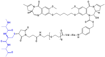 Chemical structure of "tesirine" (drawn in black). It consists of a pyrrolobenzodiazepine type dimer (top), which is the actual anti-cancer agent, a Val–Ala structure that can be cleaved by an enzyme to detach the anti-cancer agent from the antibody, a polyethylene glycol spacer, and a maleimide linker which is attached to a cysteine in the antibody's (rovalpituzumab's) peptide backbone, drawn blue. Each rovalpituzumab molecule has an average of two such attachments.[9]