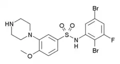 - Bromidge SM, Clarke SE, Gager T, Griffith K, Jeffrey P, Jennings AJ, et al. (January 2001). "Phenyl benzenesulfonamides are novel and selective 5-HT6 antagonists: identification of N-(2,5-dibromo-3-fluorophenyl)-4-methoxy-3-piperazin-1-ylbenzenesulfonamide (SB-357134)". Bioorganic & Medicinal Chemistry Letters. 11 (1): 55–8. doi:10.1016/S0960-894X(00)00597-7. PMID 11140733.