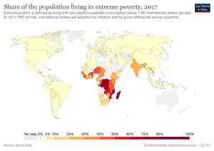 Despite the ongoing progress, 10 percent of the world's population live in poverty and struggle to meet basic needs such as health, education, and access to water and sanitation.[5] Extreme poverty remains prevalent in low-income countries particularly those affected by conflict and political upheaval.[6] In 2015, more than half of the world's 736 million people living in extreme poverty lived in Sub-Saharan Africa. Without a significant shift in social policy, extreme poverty will dramatically increase by 2030.[7] The rural poverty rate stands at 17.2 percent and 5.3 percent in urban areas (in 2016).[8] Nearly half are children.[8]