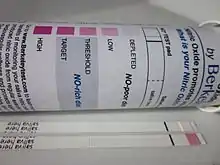 In a series of reports by Ahluwalia and colleagues, they showed in a cross over protocol of 14 volunteers who ingested inorganic nitrates, plasma and saliva nitrite level increased 3 hours post ingestion with a significant reduction of blood pressure. Nitrate extracted from blood by the salivary gland, accumulates in saliva, which is then reduced to nitric oxide to have a direct blood pressure lowering effect. Decreasing saliva nitrite in volunteers that already had elevated levels, a rise in systolic and diastolic blood pressure resulted. Furthermore, pre-hypertensives may be more sensitive to the blood pressure lowering effects of the dietary nitrate-nitrite-nitric oxide pathway.[78][79][80] Monitoring the bioconversion of plant-derived nitrate into salivary nitrite serves as a surrogate biomarker for total body nitric oxide status.[75]