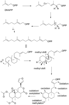 Subsequent addition of three 5-carbon IPP units to a single 5-carbon DMAPP unit generates the 20-carbon central precursor, geranylgeranyl diphosphate (GGPP). Bicyclization of GGPP by the class II diterpene synthase, ent-clerodienyl diphosphate synthase (SdCPS2), produces an Iabdanyl diphosphate carbocation, which is subsequently rearranged through a sequence of 1,2-hydride and methyl shifts to form the ent-clerodienyl diphosphate intermediate.[33] SdCPS2 catalyzes the first committed reaction in the biosynthesis of salvinorin A by producing its characteristic clerodane scaffold. A series of oxygenation, acylation and methylation reactions is then required to complete the biosynthesis of salvinorin A.