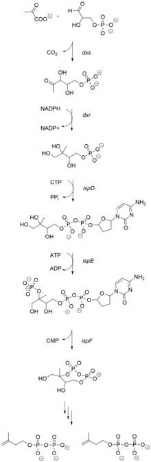 Terpenoids are biosynthesized from two 5-carbon precursors, isopentenyl diphosphate (IPP) and dimethylallyl diphosphate (DMAPP). The NMR and MS study by Zjawiony suggested that the biosynthesis of salvinorin A proceeds via the 1-deoxy-d-xylulose-5-phosphate pathway. In the deoxyxylulose phosphate pathway, D-glyceraldehyde 3-phosphate and pyruvate, the intermediates of the glycolysis, are converted into 1-deoxy-D-xylulose 5-phosphate via decarboxylation. Subsequent reduction with NADPH generates 2C-methyl-D-erythritol 2,4-cyclodiphosphate, via the intermediates 4-diphosphocytidyl-2-C-methyl-D-erythritol and 4-diphosphocytidyl-2c-methyl-d-erythritol-2-phosphate, which then lead to IPP and DMAPP.
