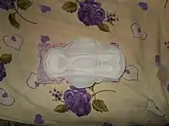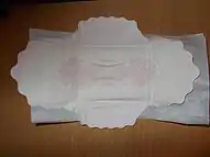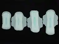 A sanitary napkin, sanitary towel, sanitary pad, menstrual pad, or pad is an absorbent item worn in the underwear when menstruating, bleeding after giving birth, recovering from gynecologic surgery, experiencing a miscarriage or abortion, or in any other situation where it is necessary to absorb a flow of blood from the vagina. A menstrual pad is a type of menstrual hygiene product that is worn externally, unlike tampons and menstrual cups, which are worn inside the vagina. Pads are generally changed by being stripped off the pants and panties, taking out the old pad, sticking the new one on the inside of the panties and pulling them back on. Pads are recommended to be changed every 3-4 hours to avoid certain bacteria that can fester in blood, this time also may differ depending on the kind you wear, your flow, and the time you are wearing it.[1]