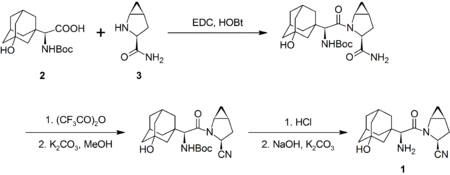 The synthesis of saxagliptin by Bristol-Myers Squibb by the amide coupling of N-Boc-3-hydroxyadamantylglycine (2) and methanoprolineamide (3) with EDC. The former is commercially available, whereas the latter is available as the N-Boc analog. The prolineamide moiety is subsequently dehydrated with trifluoroacetic anhydride to give the cyanide as the trifluoracetate ester, which is hydrolyzed. Removal of the Boc protecting group, followed by neutralization gives the desired product (1):[17]