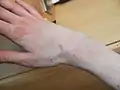 The characteristic symptoms of a scabies infection include intense itching and superficial burrows.[16] Because the host develops the symptoms as a reaction to the mites' presence over time, typically a delay of four to six weeks occurs between the onset of infestation and the onset of itching. Similarly, symptoms often persist for one to several weeks after successful eradication of the mites. As noted, those re-exposed to scabies after successful treatment may exhibit symptoms of the new infestation in a much shorter period—as little as one to four days.[17]