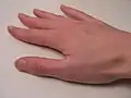 The most frequently diagnosed form of scabies in domestic animals is sarcoptic mange, caused by the subspecies Sarcoptes scabiei canis, most commonly in dogs and cats. Sarcoptic mange is transmissible to humans who come into prolonged contact with infested animals,[59] and is distinguished from human scabies by its distribution on skin surfaces covered by clothing. Scabies-infected domestic fowl suffer what is known as "scaly leg". Domestic animals that have gone feral and have no veterinary care are frequently afflicted with scabies and a host of other ailments.[60] Nondomestic animals have also been observed to suffer from scabies. Gorillas, for instance, are known to be susceptible to infection by contact with items used by humans.[61]