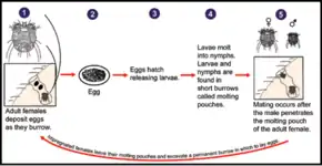 S. scabiei mites are under 0.5 mm in size, but are sometimes visible as pinpoints of white. Gravid females tunnel into the dead, outermost layer (stratum corneum) of a host's skin and deposit eggs in the shallow burrows. The eggs hatch into larvae in three to ten days. These young mites move about on the skin and molt into a "nymphal" stage, before maturing as adults, which live three to four weeks in the host's skin. Males roam on top of the skin, occasionally burrowing into the skin. In general, the total number of adult mites infesting a healthy hygienic person with noncrusted scabies is small, about 11 females in burrows, on average.[22]