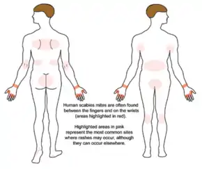 Scabies is caused by infection with the female mite Sarcoptes scabiei var. hominis, an ectoparasite.[3] The mites burrow into the skin to live and deposit eggs.[3] The symptoms of scabies are due to an allergic reaction to the mites.[2] Often, only between 10 and 15 mites are involved in an infection.[2] Scabies is most often spread during a relatively long period of direct skin contact with an infected person (at least 10 minutes) such as that which may occur during sex or living together.[3][9] Spread of the disease may occur even if the person has not developed symptoms yet.[10] Crowded living conditions, such as those found in child-care facilities, group homes, and prisons, increase the risk of spread.[3] Areas with a lack of access to water also have higher rates of disease.[4] Crusted scabies is a more severe form of the disease.[3] It typically only occurs in those with a poor immune system and people may have millions of mites, making them much more contagious.[3] In these cases, spread of infection may occur during brief contact or by contaminated objects.[3] The mite is very small and usually not directly visible.[3] Diagnosis is based on the signs and symptoms.[5]