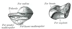 The dorsal surface of the bone is narrow, with a groove running the length of the bone and allowing ligaments to attach, and the surface facing the fingers (anatomically inferior) is smooth and convex, also triangular, and divided into two parts by a slight ridge.[3]