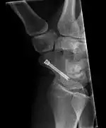 The scaphoid can be slow to heal because of the limited circulation to the bone. Fractures of the scaphoid must be recognized and treated quickly, as prompt treatment by immobilization or surgical fixation increases the likelihood of the bone healing in anatomic alignment, thus avoiding mal-union or non-union.[5] Delays may compromise healing. Failure of the fracture to heal ("non-union") will lead to post-traumatic osteoarthritis of the carpus.[1]:189 One reason for this is because of the "tenuous" blood supply to the proximal segment.[2] Even rapidly immobilized fractures may require surgical treatment, including use of a headless compression screw such as the Herbert screw to bind the two halves together.