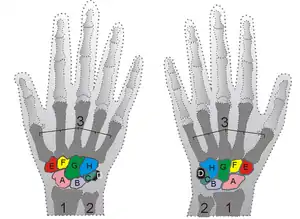 Shown is the right hand, palm down (left) and palm up (right). A=Scaphoid, B=Lunate