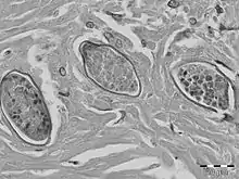 S. malayensis eggs have been found in liver granulomas, embedded within dense, fibrous tissue. The eggs of S. malayensis have a thin-walled, yellowish shell. The eggs contain miracidia and are approximately 50 μm long × 28 μm wide. The ova is not operculated and has no bipolar plugs and the thin covering was not striated.[6]