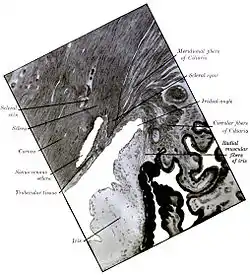 It is the origin of the longitudinal and circular fibres (which swerve acutely from the spur to run circumferentially, as a sphincter near the periphery of the lens)[1] of the ciliary muscle, and is attached anteriorly to the trabecular meshwork.